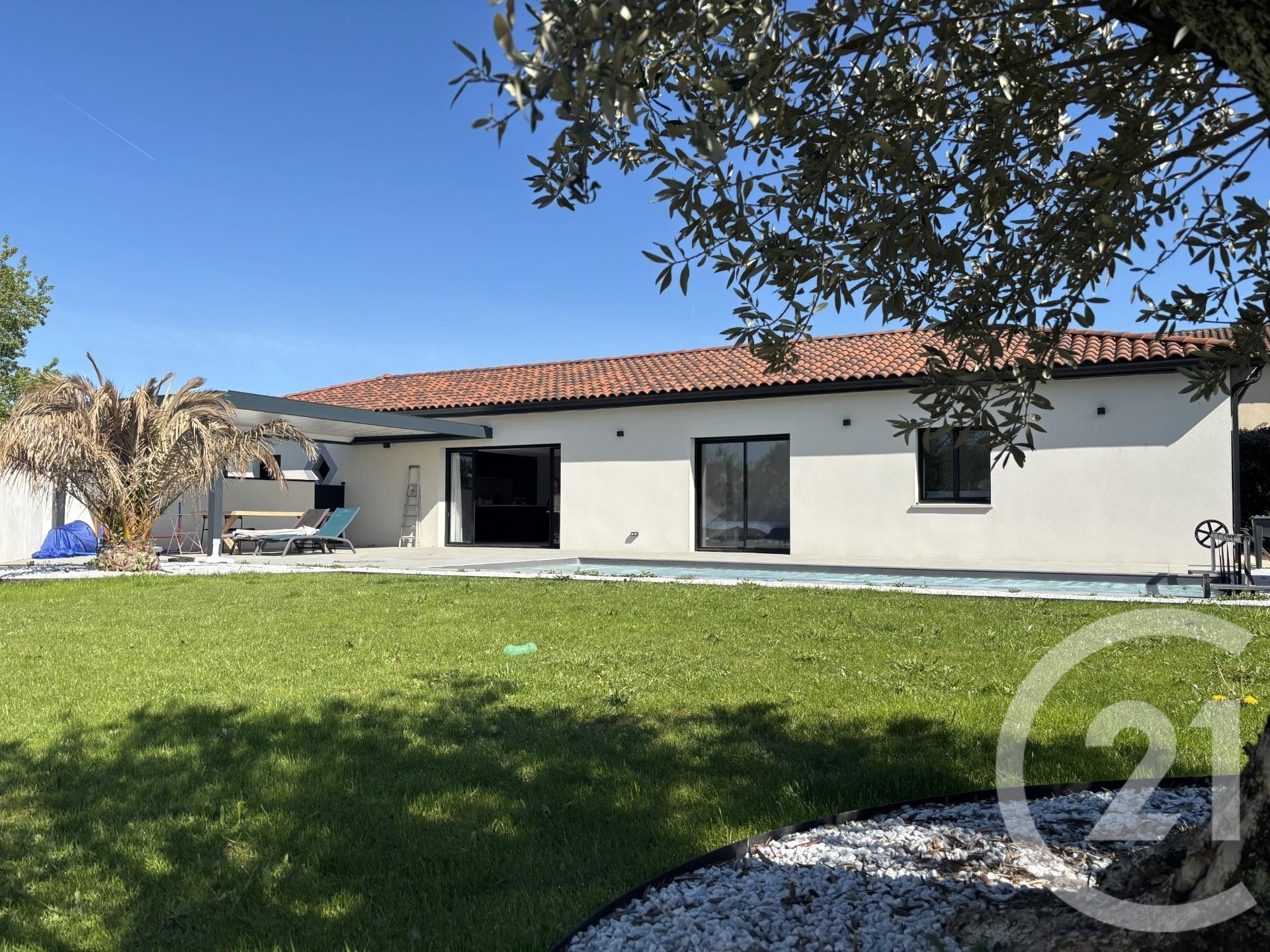 Son vaste séjour de 58m2 donne un accès direct sur la terrasse afin de profiter pleinement de sa piscine.